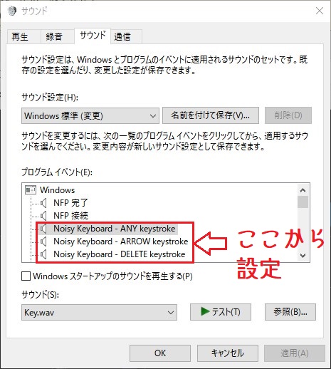 ②サウンド タブ内の「Noisy Keyboard -」 から音を設定する。